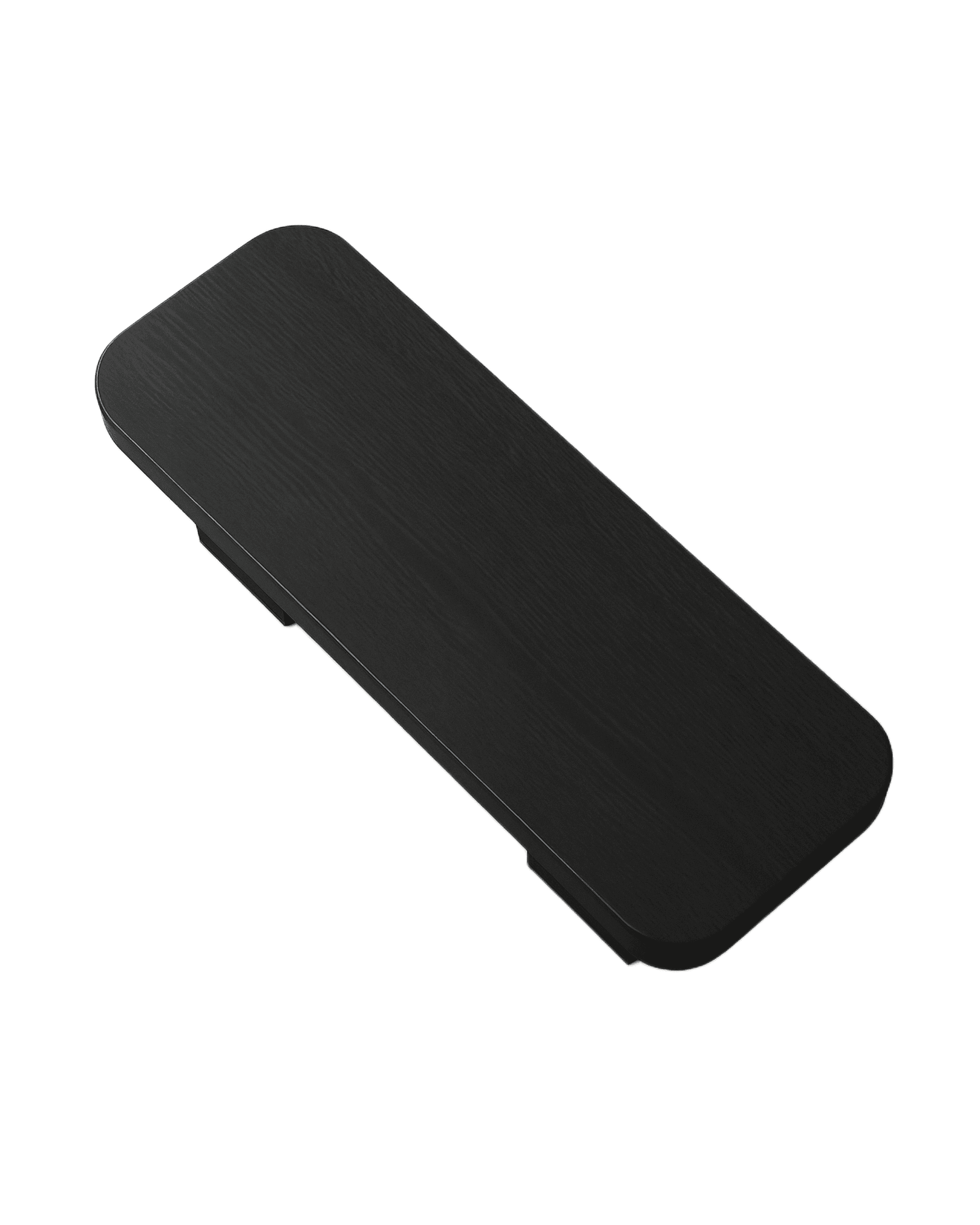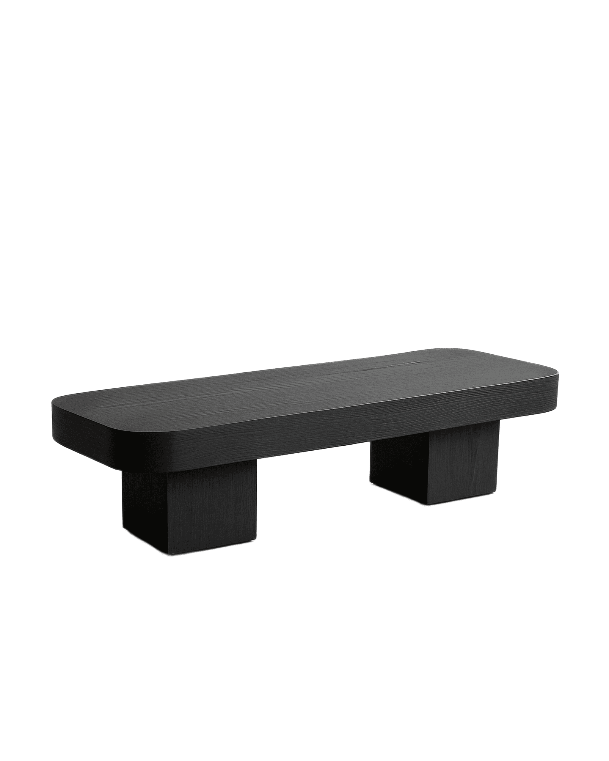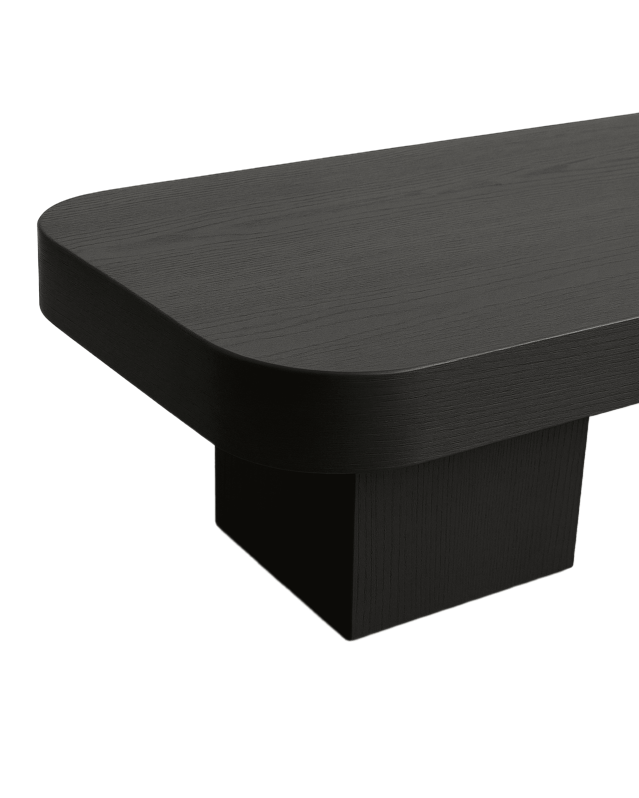 — its elongated black oak form softened by rounded edges and supported by two monumental block legs. Its proportions are quiet yet assured — a surface that holds space with calm authority. The flowing grain across its surface speaks in undertones, a movement contained within stillness. As a low center table, Forma brings intimacy to the living room.