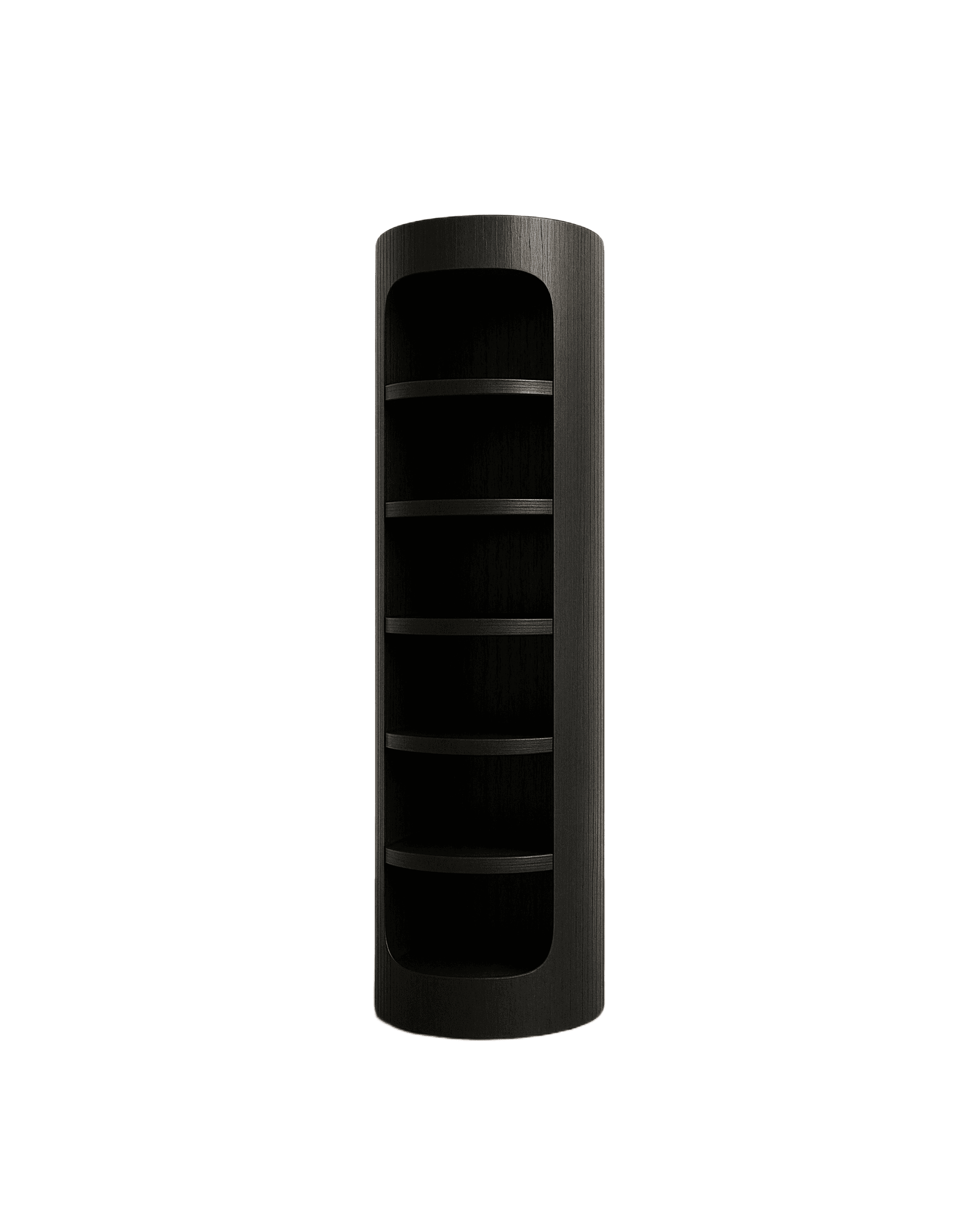 — Numa is a vessel of stillness — a carved monolith in matte blackened oak. Its curved silhouette and softened front opening reveal five sculpted shelves, designed not just for storage but for contemplation. Each arc draws you inward, like an alcove for objects that matter. Whether used for books, relics, or left empty in restraint, Numa holds space with quiet authority. Crafted for those who see furniture as architecture, Numa belongs in rooms that listen as much as they speak.It is a pause.